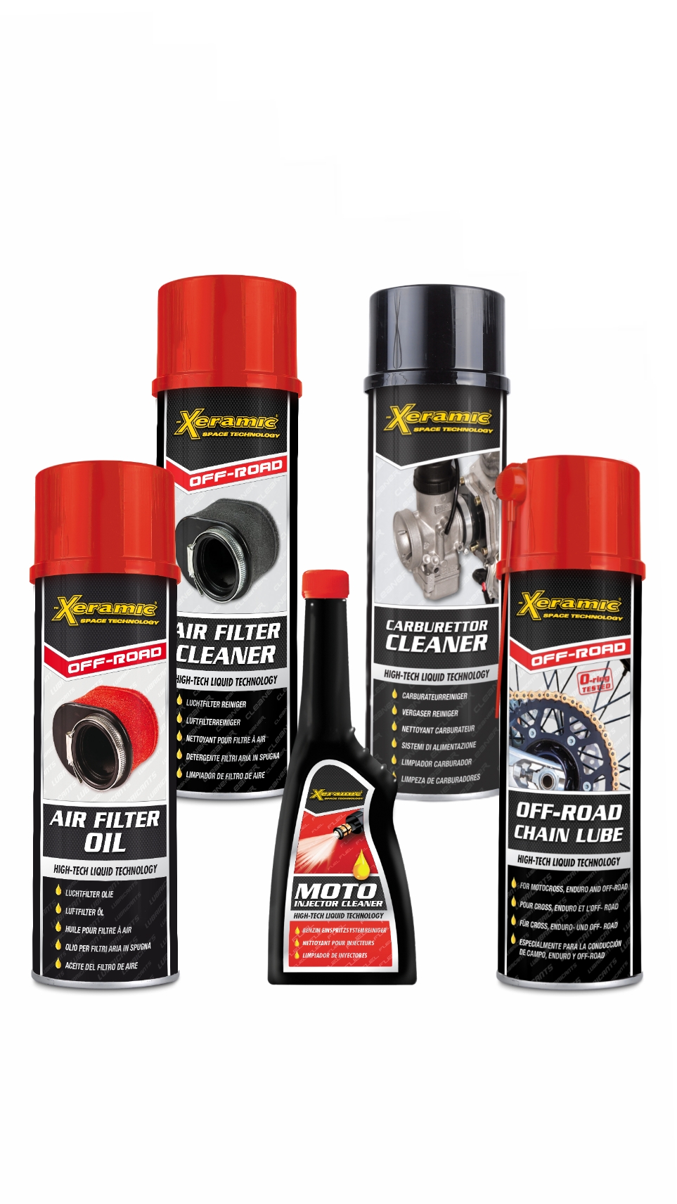 Professzionális tisztító-, és kenőanyag csomag, off-road, enduro motorkerékpárok, és láncmeghajtású quadok minőségi karbantartásához. Egy poros, sáros terepen használt járműnél kiemelten fontos a motor levegőszűrőjének, karburátorának, befecskendező rendszerének tisztán tartása és a láncmeghajtás egyenletes kenése. Az etanolos üzemanyag gyantás lerakódása ellen, a rendszeres üzemanyag adalékok használata, igazoltan növeli a motor hatásfokát, teljesítményét és élettartamát. A kimondottan poros terepekre kifejlesztett Xeramic Off Road lámcspray rendszeres használata jelentősen növeli a lánc-lánckerék hatékonyságát és annak élettartamát.